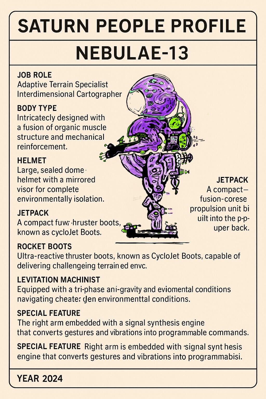 The Saturn People are travelers of uncharted worlds, each engineered for a unique environment far beyond Earth. Powered by advanced propulsion systems — rockets, levitation drives, and biomechanical movement — they explore the vast reaches of unknown planets, collecting data, uncovering life, and documenting worlds