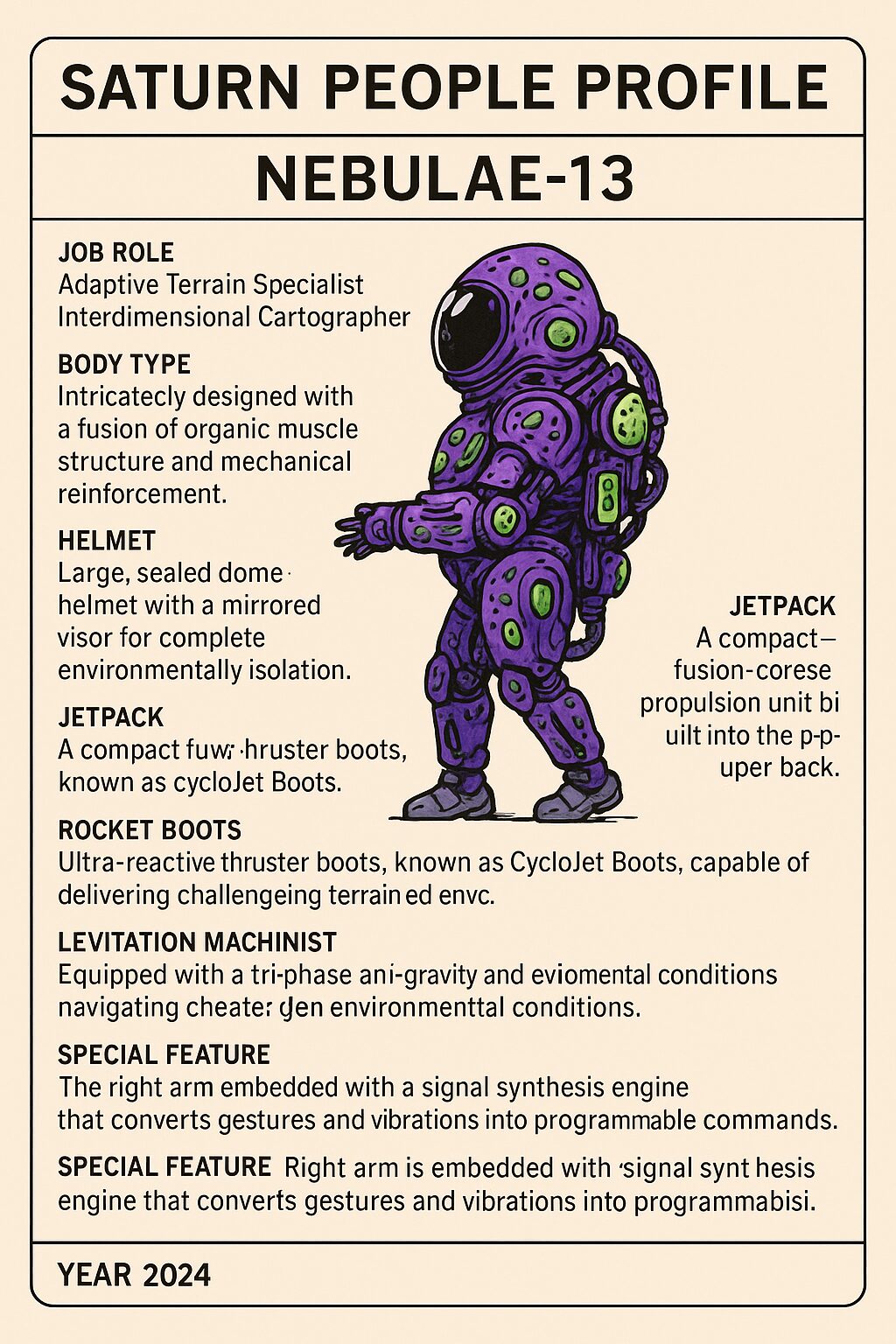The Saturn People are travelers of uncharted worlds, each engineered for a unique environment far beyond Earth. Powered by advanced propulsion systems — rockets, levitation drives, and biomechanical movement — they explore the vast reaches of unknown planets, collecting data, uncovering life, and documenting worlds never seen by human eyes. Every Saturn Person carries a specialized mission, adding to the growing archive of Saturn People Worlds — a living record of exploration, technology, and discoveryThe Saturn People are travelers of uncharted worlds, each engineered for a unique environment far beyond Earth. Powered by advanced propulsion systems — rockets, levitation drives, and biomechanical movement — they explore the vast reaches of unknown planets, collecting data, uncovering life, and documenting worlds never seen by human eyes. Every Saturn Person carries a specialized mission, adding to the growing archive of Saturn People Worlds — a living record of exploration, technology, and discovery.